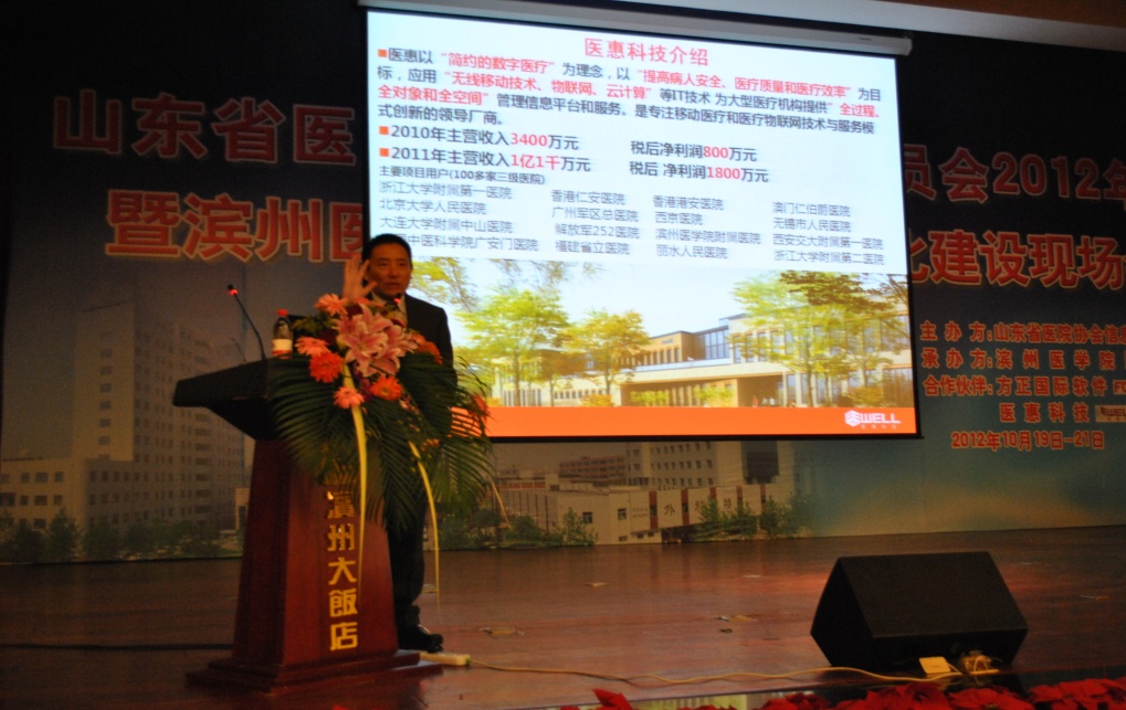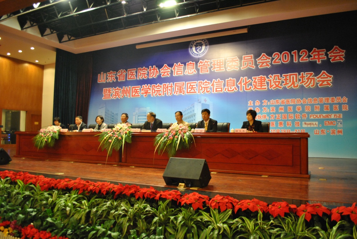 2012年(nian)10月19~20日,由山(shan)東(dong)(dong)省(sheng)醫(yi)院協會信息(xi)管(guan)理(li)(li)專業委員會主辦、濱州醫(yi)學院附屬醫(yi)院承辦的“2012年(nian)山(shan)東(dong)(dong)省(sheng)醫(yi)院信息(xi)化建(jian)設(she)學術交流會”在(zai)山(shan)東(dong)(dong)省(sheng)濱州市(shi)勝利召開并(bing)圓(yuan)滿閉幕;中(zhong)(zhong)(zhong)國(guo)醫(yi)院協會副(fu)會長(chang)、山(shan)東(dong)(dong)省(sheng)醫(yi)院協會會長(chang)董先雨教授、中(zhong)(zhong)(zhong)國(guo)衛生信息(xi)學會副(fu)會長(chang)、中(zhong)(zhong)(zhong)國(guo)醫(yi)院協會信息(xi)管(guan)理(li)(li)專業委員會常務(wu)副(fu)主任委員李包(bao)羅(luo)教授、中(zhong)(zhong)(zhong)國(guo)衛生管(guan)理(li)(li)研究(jiu)所(suo)(suo)所(suo)(suo)長(chang)助理(li)(li)馬麗平主任等專家出席(xi)本(ben)次(ci)會議(yi),并(bing)做(zuo)大(da)(da)會發(fa)言。我(wo)公司總裁章(zhang)笠中(zhong)(zhong)(zhong)受邀參加(jia)此次(ci)大(da)(da)會,并(bing)特邀做(zuo)大(da)(da)會主題報告。